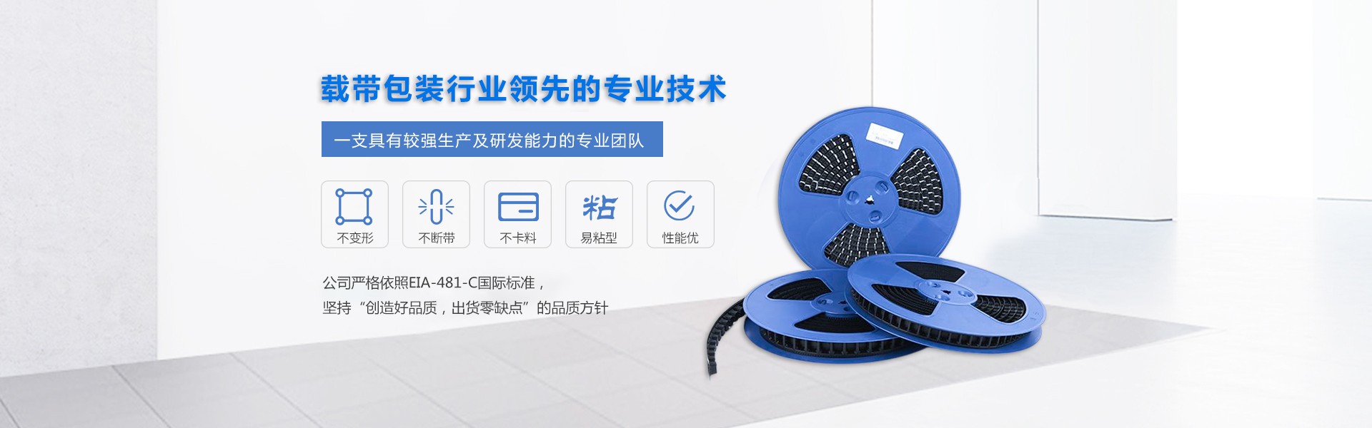 公司拥有一支具有较强生产及研发能力的专业团队,即使是不规则形状电子元件的包装载带,公司亦能根据客户要求设计制作。公司严格依照EIA-481-C国际标准,坚持“创造好品质,出货零缺点”的品质方针,层层把关,力求产品稳定可靠。目前产品已经得到国内外多家大厂的承认及使用。